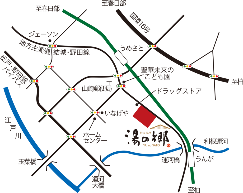 【お車でお越しのお客様】 【水戸方面】 柏IC⇒国道16号線春日部方面⇒流山街道⇒湯の郷 【東京方面】 流山IC⇒松戸野田バイパス野田方面⇒湯の郷 【電車でお越しのお客様】 東武野田線(東武アーバンパークライン)梅郷駅下車徒歩約15分 ※西口を降りて100mほどまっすぐ進み、京葉銀行梅郷支店様がある交差点(「梅郷駅西口」交差点) を左に曲がってそのまま道なり(流山街道沿い)。